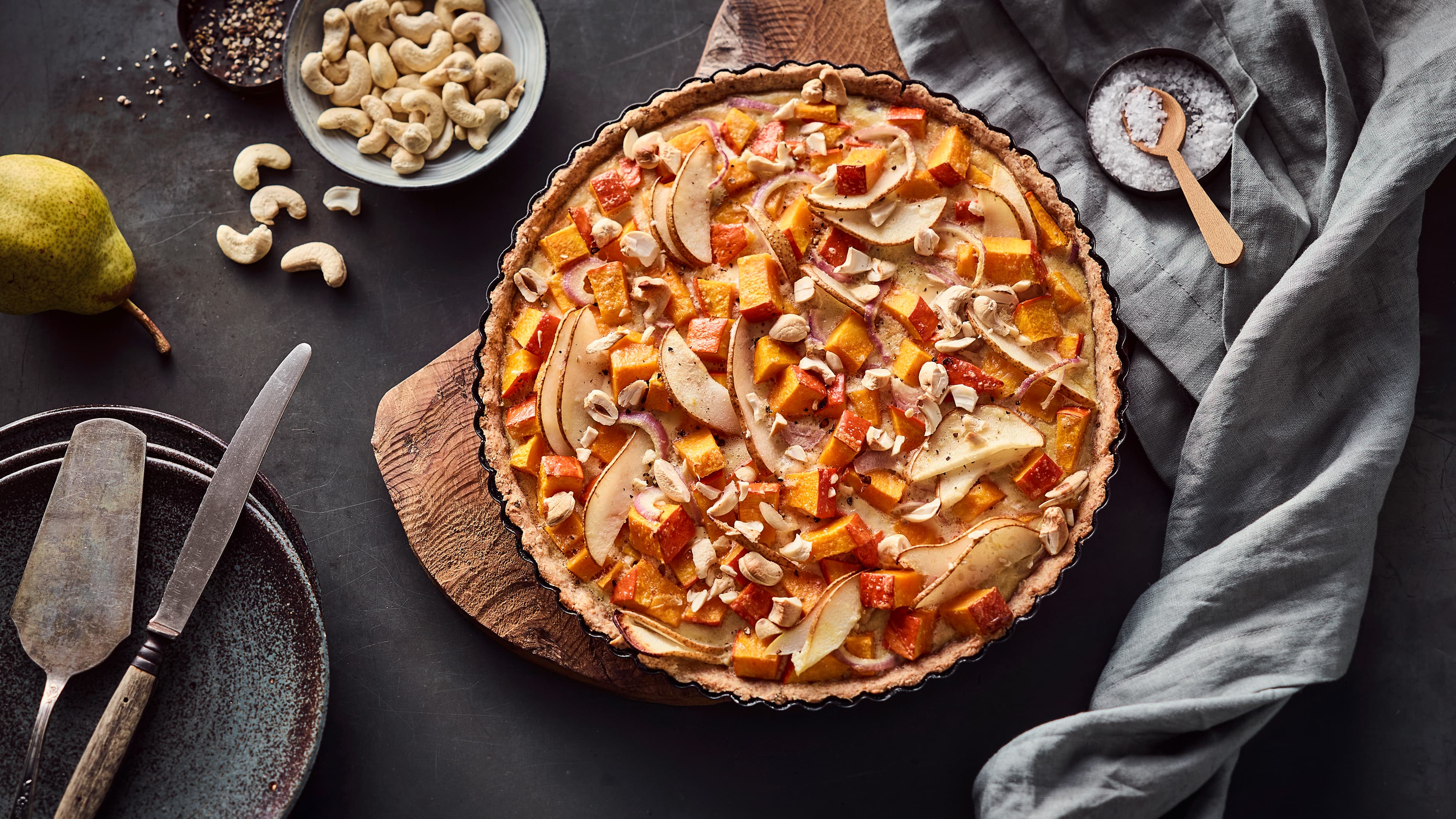 Unser Tipp für eine vollwertige Herbstmahlzeit: Probieren Sie unsere Kürbis-Birnen-Tarte mit Schafskäse, Cashewkernen und Gorgonzola-Weißwein-Guss!