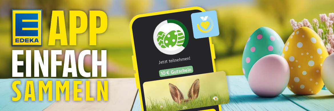 Zu Ostern genießen und sammeln mit der EDEKA App. Einfach Challenge in der App aktivieren, 4x im Aktionszeitraum vom 02.03.-04.04.26 für mind. 50 € einkaufen und einen 10 € Gutschein für deinen nächsten Einkauf ab 50 € als Prämie erhalten.