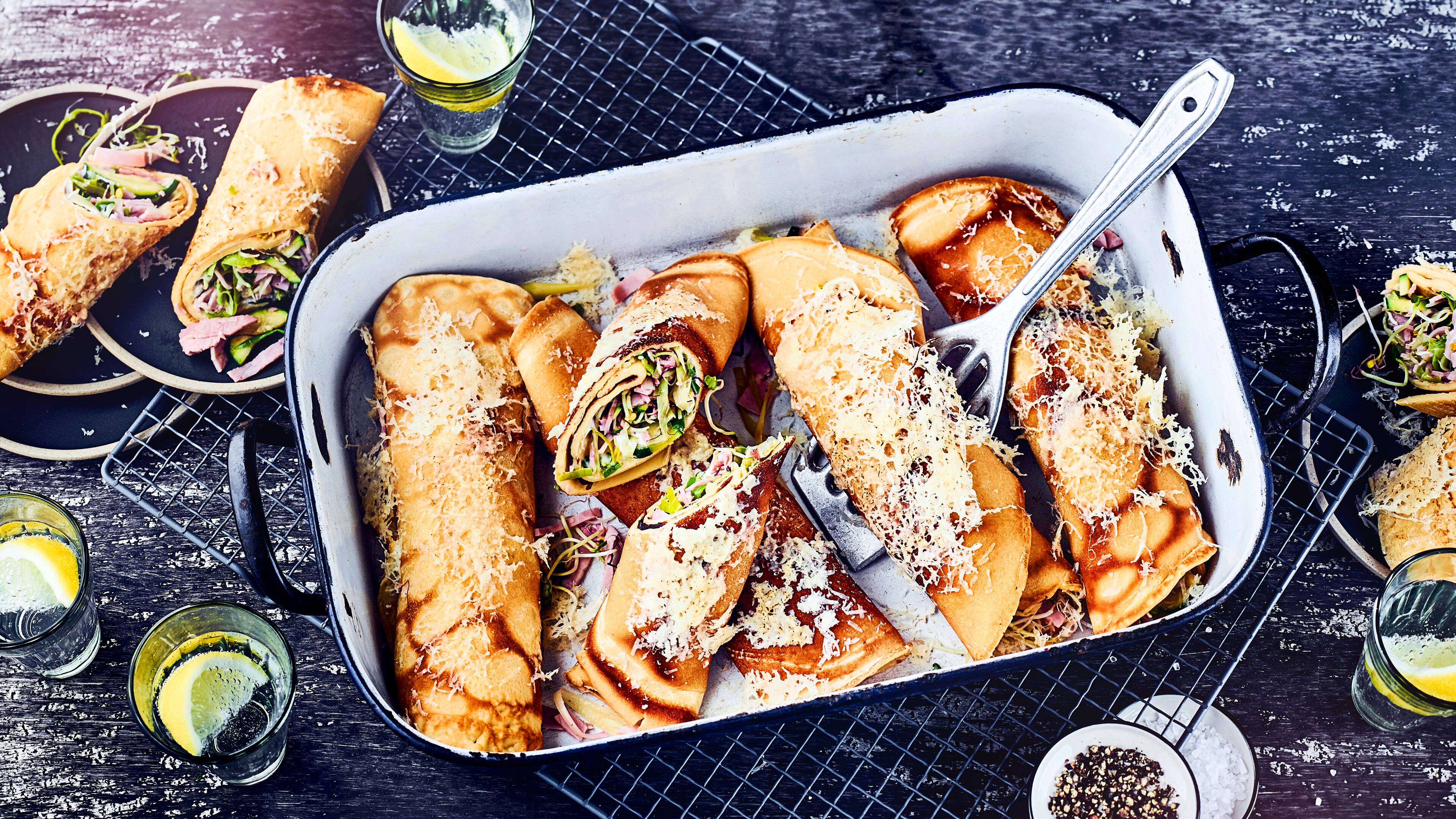 Backofen auf 180 Grad Ober-/Unterhitze vorheizen. Pfannkuchen-Zutaten verquirlen und einige Minuten quellen lassen. Nacheinander in heißem Rapsöl vier große Pfannkuchen ausbacken und zwischen zwei großen Tellern lagern, damit sie nicht austrocken.