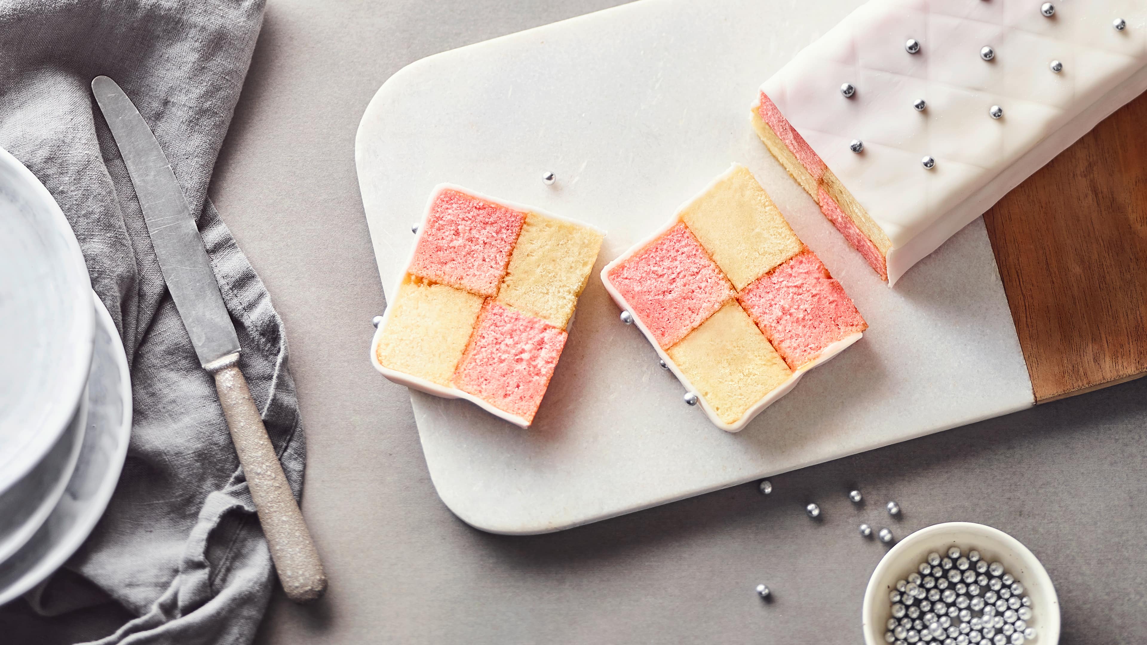 Die dunkle Kruste der Kuchen abschneiden und jeden Kuchen der Länge nach in zwei gleich große Streifen schneiden. Einen roten und einen ungefärbten Teigstreifen nebeneinanderlegen.