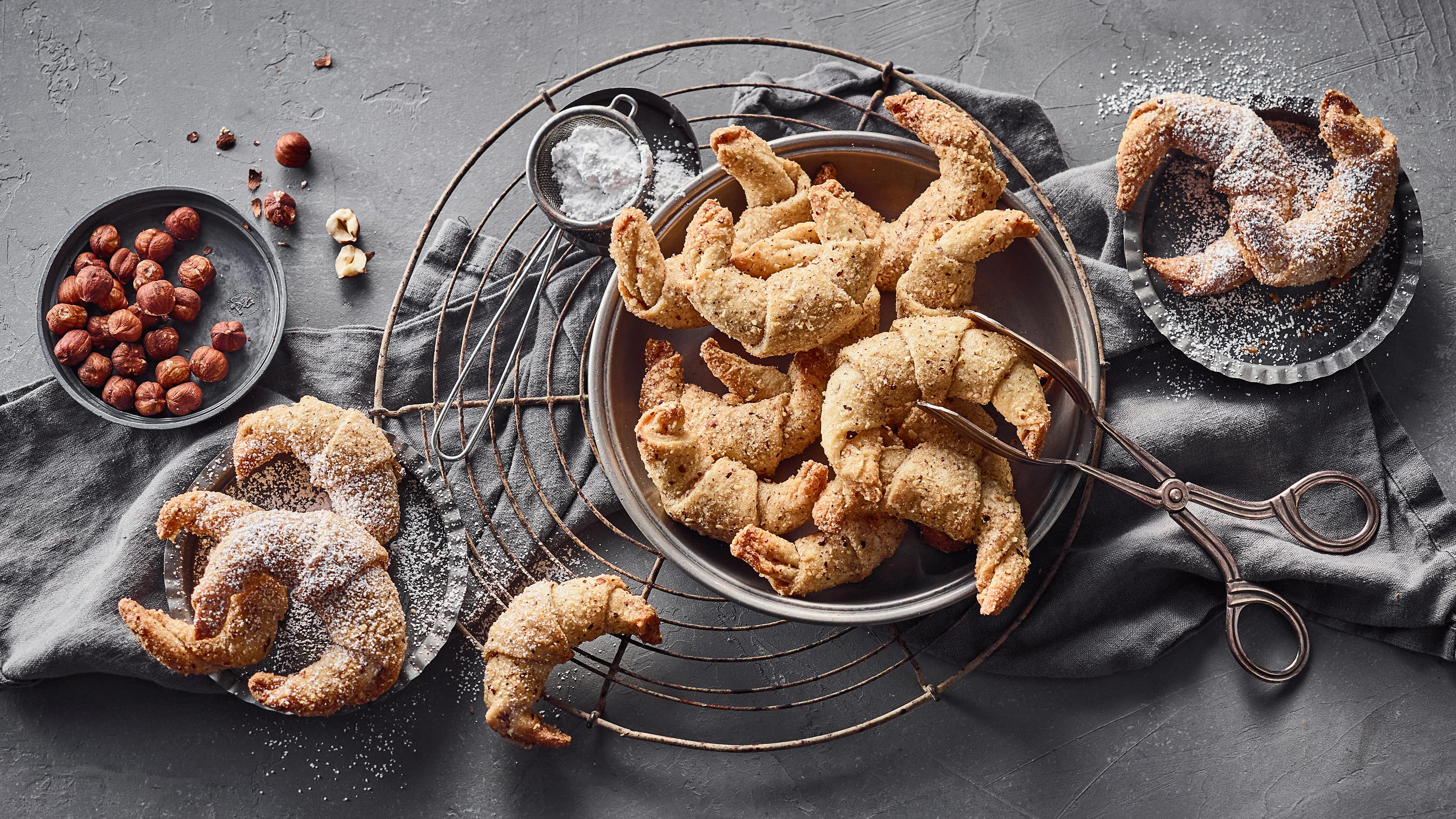 Die fertig panierten Teigkreise mit einem Pizzaschneider in 16 Stücke teilen. Jedes Teigstück von außen nach innen einrollen, sodass ein Hörnchen entsteht. Mit ausreichend Abstand auf mit Backpapier belegte Backbleche geben. Nach Belieben erneut mit etwas Panade bestreuen. Für ca. 15 Minuten auf mittlerer Schiene im Ofen backen, bis die Hörnchen eine leichte Bräunung angenommen haben. Herausnehmen und abkühlen lassen.