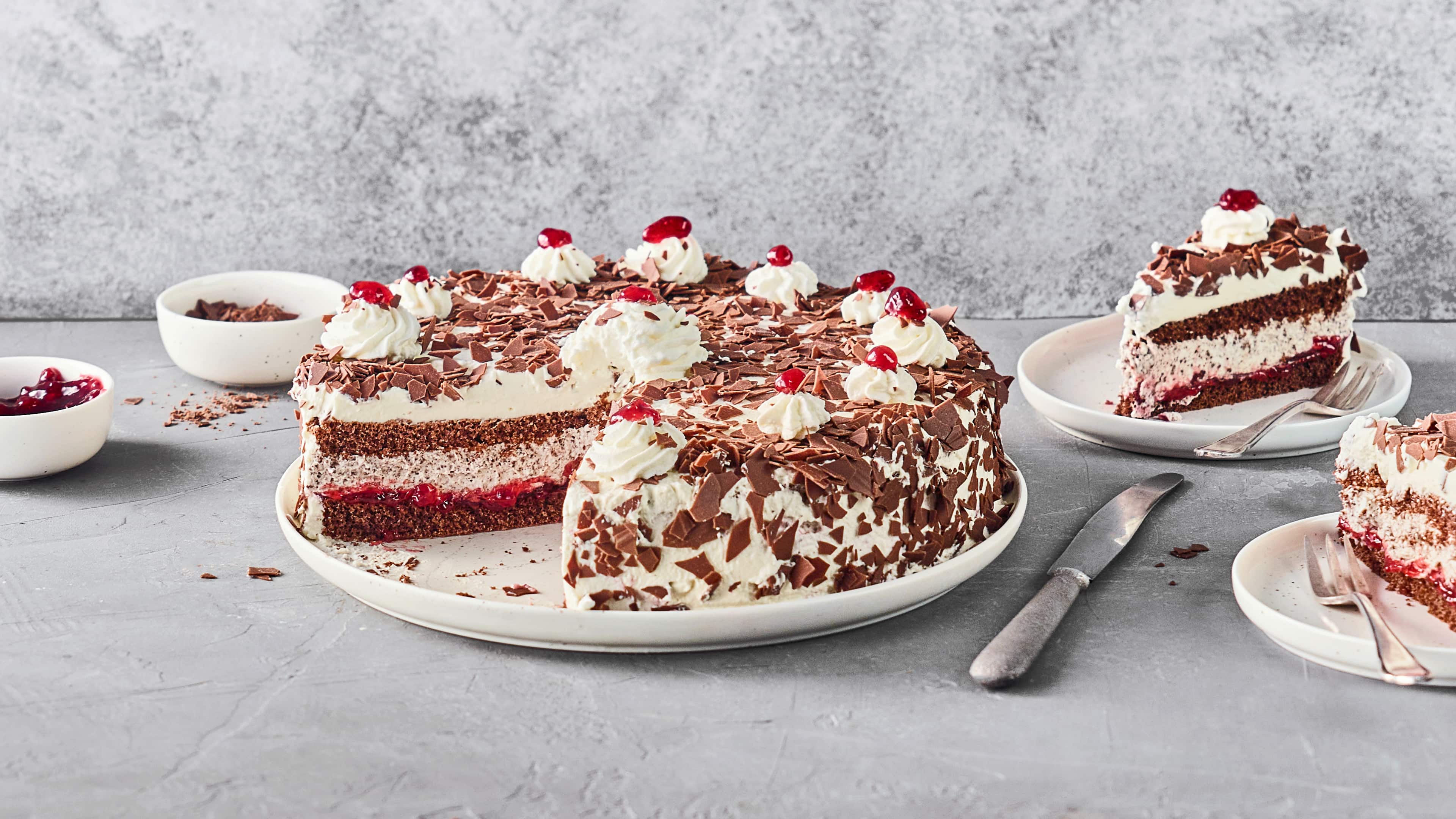 Den zweiten Tortenboden aufsetzen und wie zuvor mit Preiselbeeren sowie der Schlagsahne toppen. Für zwei Stunden im Kühlschrank kalt stellen.