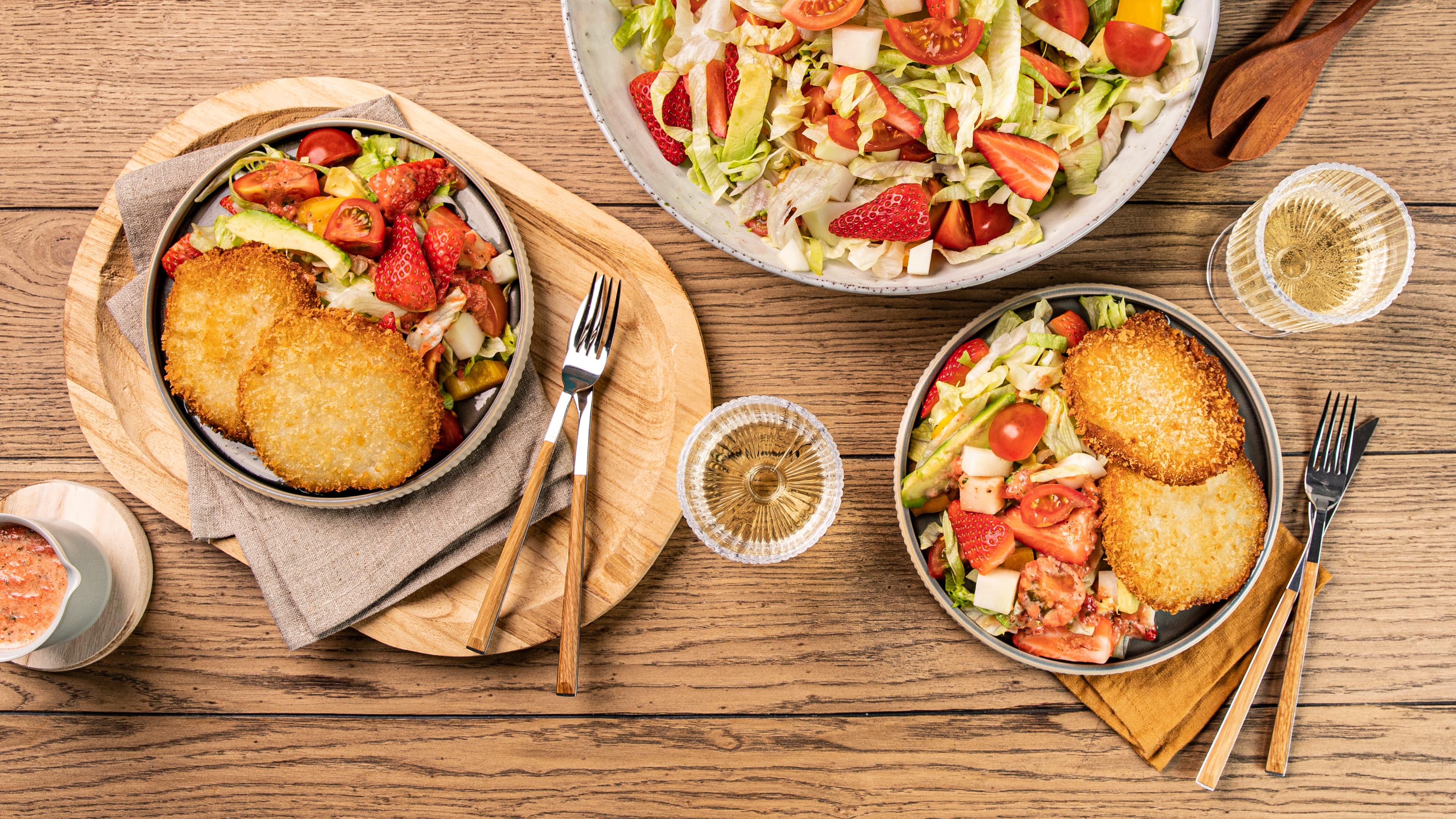 Öl in einer Pfanne erhitzen und Kohlrabischnitzel bei mittlerer Hitze von beiden Seiten ca. 4 Minuten goldbraun anbraten. Kohlrabischnitzel anschließend auf Küchenpapier abtropfen lassen. Vegane Kohlrabischnitzel mit Salat und Erdbeer-Vinaigrette anrichten.