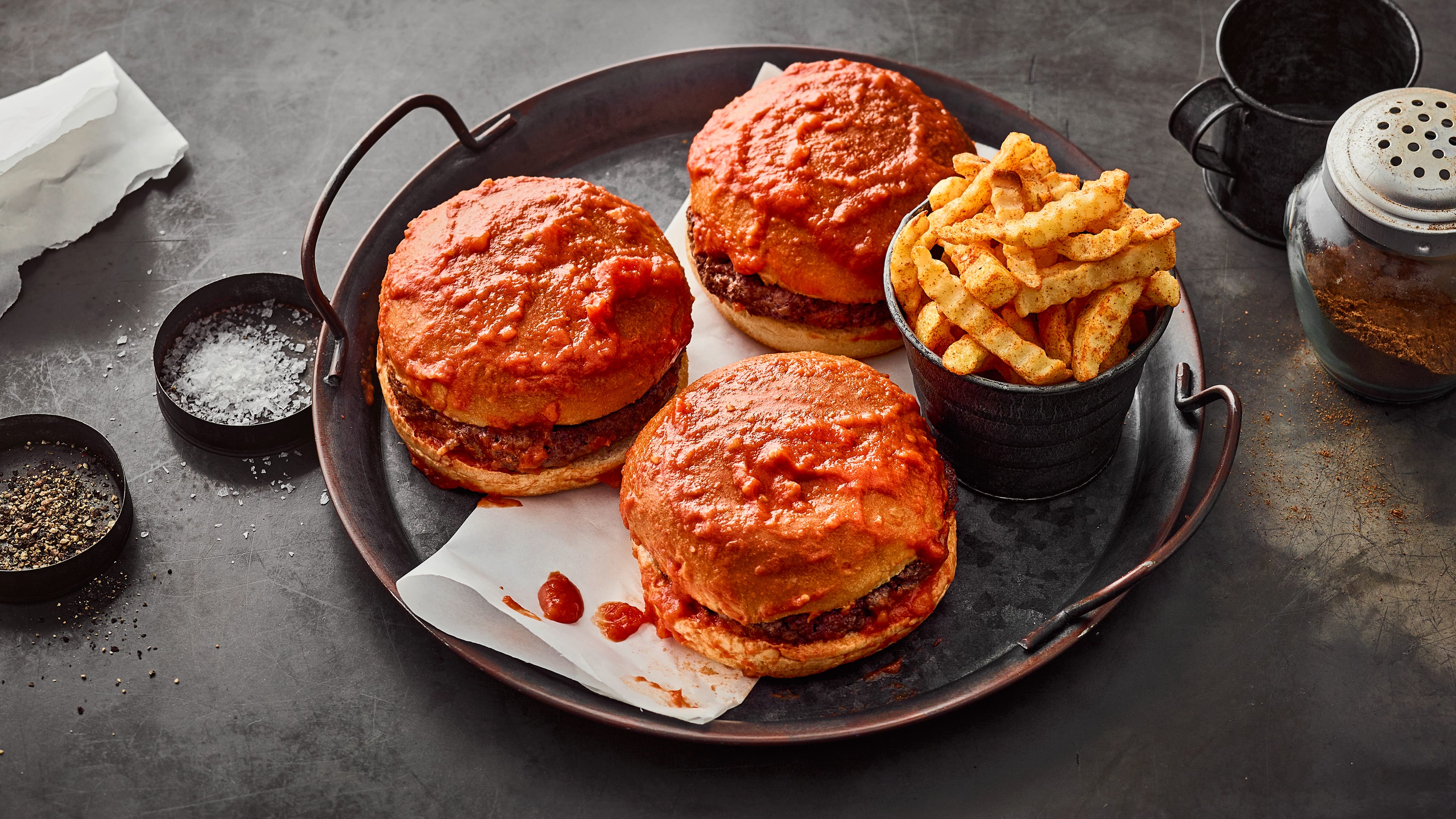 Bratöl in einer beschichteten Pfanne erhitzen und die Burger Patties darin von beiden Seiten 4-5 Minuten durchbraten. Inzwischen die Ober- und Unterseite der Burger Buns jeweils von innen und außen mit der Tomatensoße bedecken. Die Burger Patties auf die Buns verteilen und den Deckel aufsetzen.