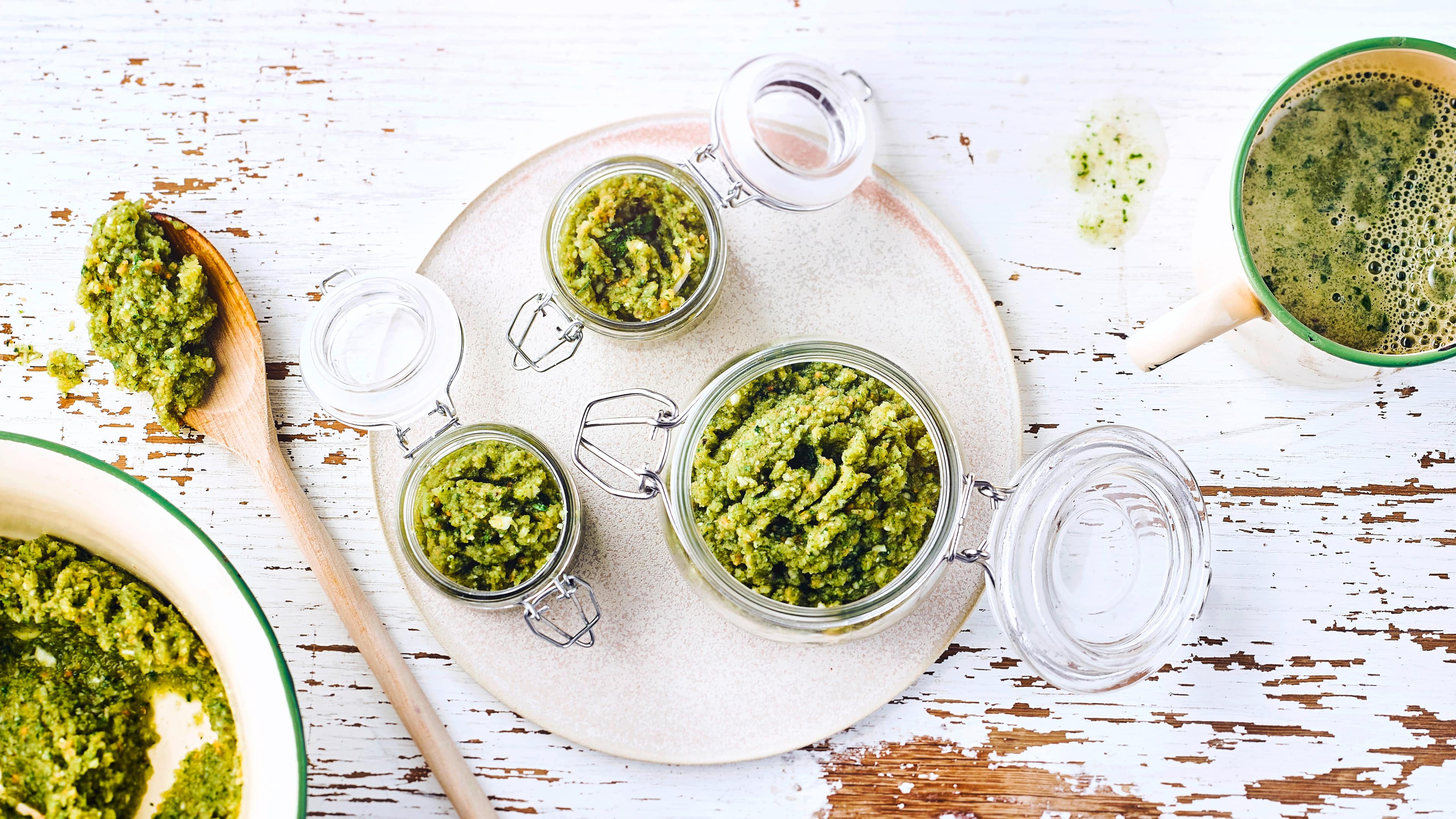 Gemüse in grobe Stückchen schneiden und Kräuter hacken. Beides in einem Mixer oder Food Processor ca. 2-3 Min. fein häckseln.