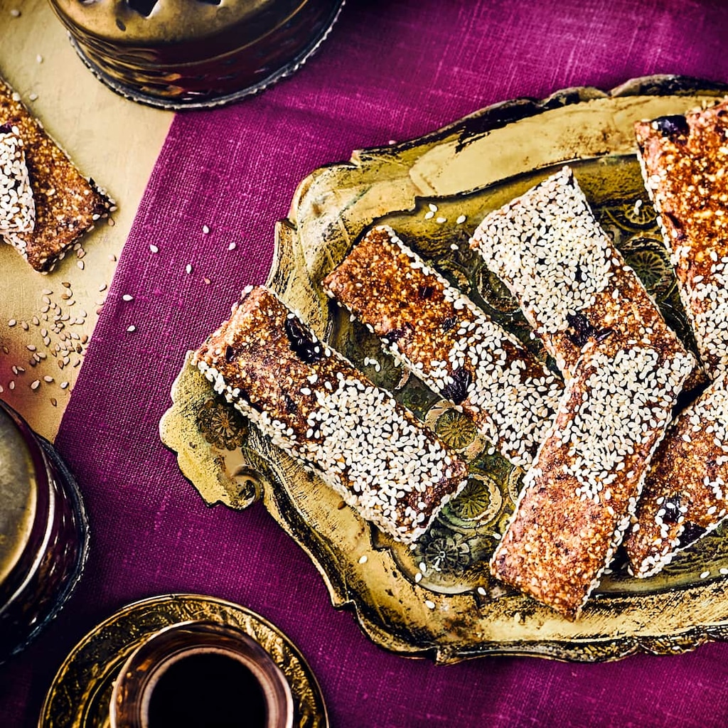Keine Lust, erst den Ofen anzuheizen? Sie können Müsliriegel selber machen – selbst ohne sie zu backen. Das gelingt beispielsweise hervorragend mit klebrigen Trockenfrüchten, die mit etwas Flüssigkeit zu einem Teig püriert und nach Wunsch um weitere Zutaten ergänzt werden. Die Masse für unsere Dattel-Riegel lässt sich anschließend einfach ausrollen und in Stücke schneiden. Durch das Wälzen in Sesam – oder anderen Samen nach Wahl – lassen sich die Snacks gut verarbeiten und in Folie oder Backpapier wickeln. Diese Müsliriegel sind übrigens glutenfrei und für eine Ernährung ohne das Klebereiweiß geeignet.