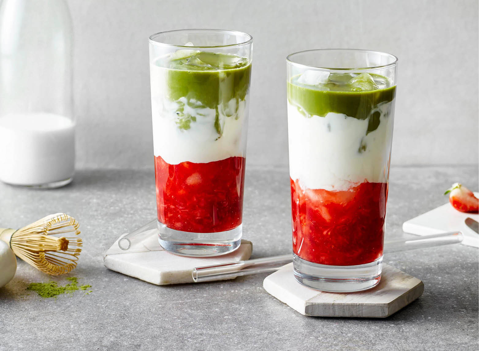 Fruchtig trifft herb: Frische Erdbeeren pürieren, mit Matcha und kaltem Wasser oder Milch aufgießen, Eiswürfel rein und fertig ist der sommerliche Energy-Drink mit Wow-Effekt.