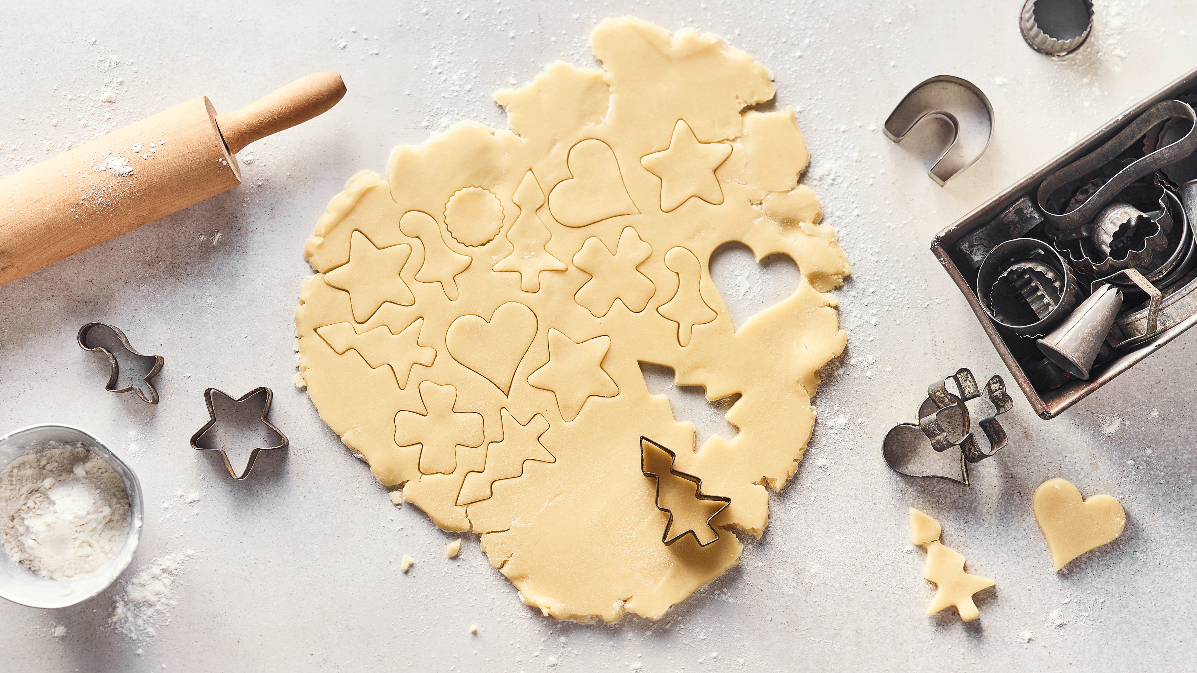 Teig auf einer leicht bemehlten Arbeitsfläche ca. 0,5 cm dick ausrollen und mit beliebigen Ausstechformen ausstechen. Teigreste zügig verkneten und erneut ausstechen. Plätzchen mit ausreichend Abstand auf zwei mit Backpapier ausgelegte Backbleche verteilen und für ca. 12 Minuten backen.