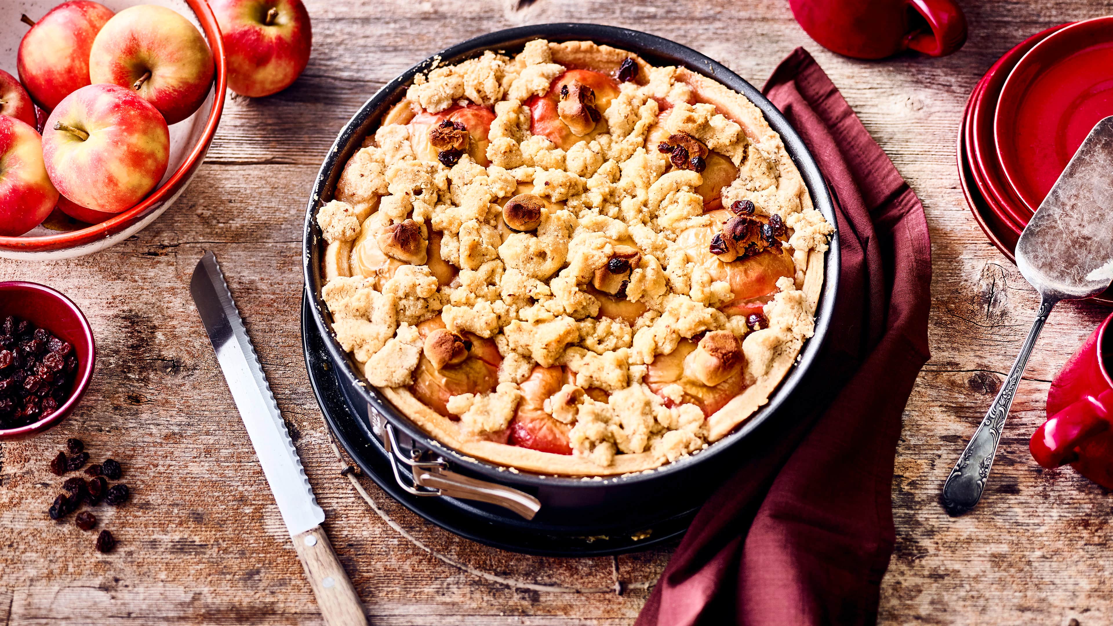 Den Mürbeteig auf einer bemehlten Arbeitsfläche ca. 0,3 cm stark ausrollen und die Springform damit auskleiden. Die gefüllten Äpfel in die Form setzen.
