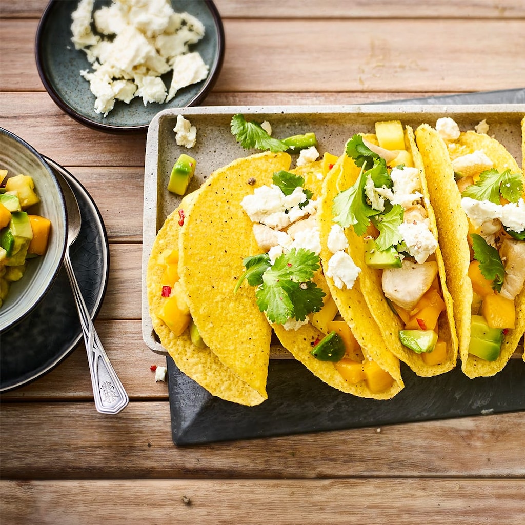 Für die Spieße die Mango(s) schälen und in Stücke schneiden. Hähnchenbrust in etwa 3 cm große Würfel schneiden. Zwiebeln schälen und vierteln. Auf jeden Spieß abwechselnd 3 Mangowürfel, 3 Stücke Hähnchenbrust und ein Stück Zwiebel stecken. Spieße in eine flache Schale legen.