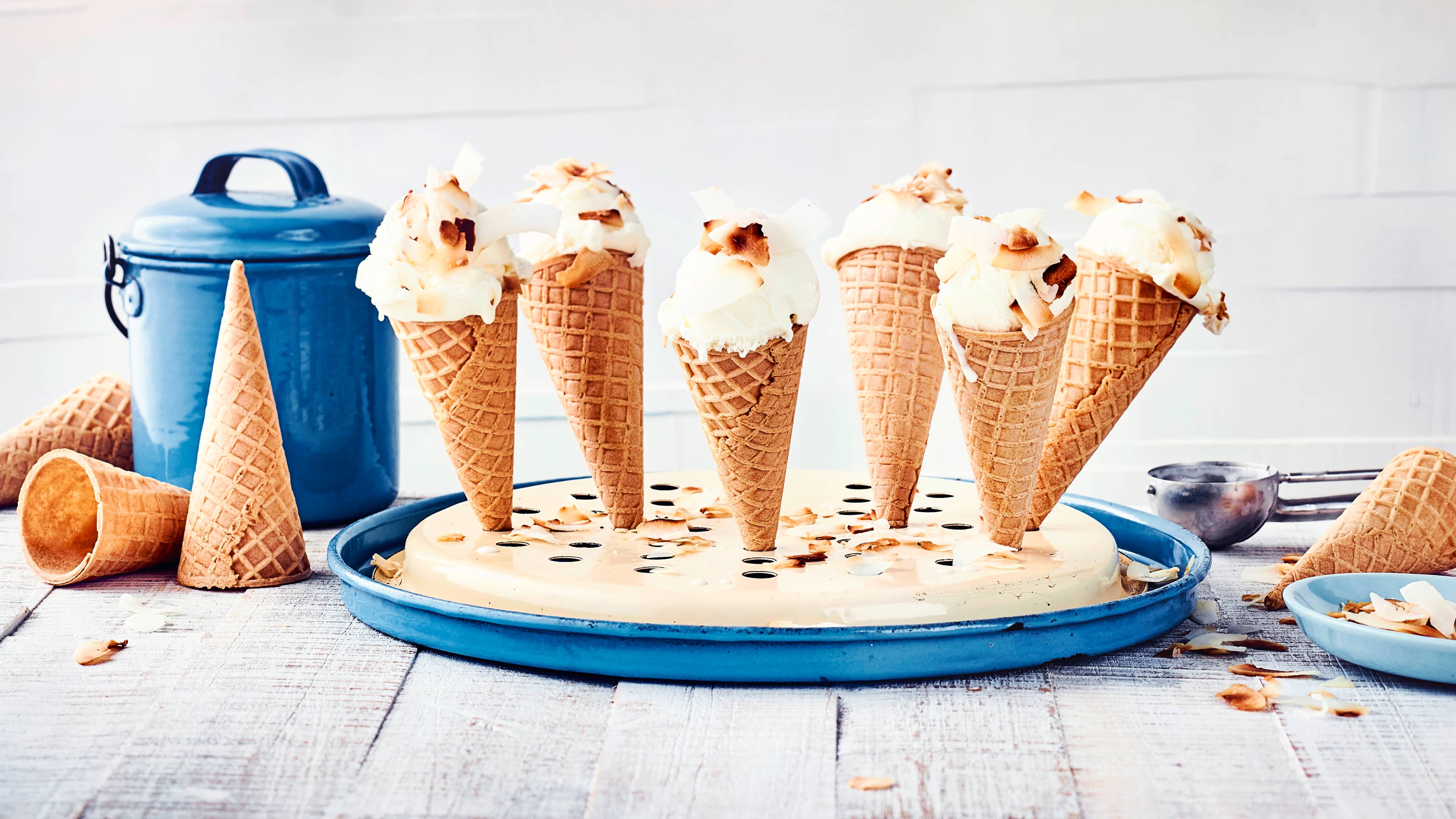 Klar, das leckere Eis aus der italienischen Eisdiele im Viertel ist schon was Feines. Aber es hat auch seine Vorteile, Eiscreme selbst zu machen: Es ist erstens überhaupt nicht schwierig, und zweitens wissen Sie dann genau, was drin ist. Etwa wenn Sie in Ihrer Ernährung auf weniger Zucker achten, vegan leben – hier unser Rezept für veganes Eis ohne Eismaschine – oder ganz einfach bestimmte Stoffe nicht vertragen. Unser Kokoseis-Rezept besteht nur aus sechs Zutaten ‒ wenn Sie das Rezept vegan umsetzen möchten, erhöhen Sie einfach den Anteil der Kokosmilch um 200 ml und lassen Sie die Sahne dafür weg. Das Kokoseis-Rezept lässt sich schnell zubereiten, lediglich das Gefrieren dauert seine Zeit. Am schnellsten geht es in der Eismaschine, da können Sie je nach Modell nach 30 bis 60 Minuten cremiges Kokoseis naschen. Aber auch ohne Maschine gelingt Ihnen die Zubereitung der Kokos-Eiscreme oder anderer Eis-Rezepte – wir sagen Ihnen, wie!