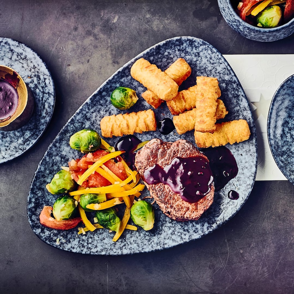Backofentemperatur auf 220 Grad erhöhen. Das Fleisch auf das Gemüse setzen und auf der mittleren Schiene ca. 12 Minuten überbacken. Joghurt, 1 EL Zitronenschale, Salz und restliches Ölverrühren. Restliche Petersilie hacken. Den Bräter aus dem Ofen nehmen. Das Fleisch 5 Minuten ruhen lassen, mit der Petersilie bestreuen und mit dem Joghurt-Dip servieren.