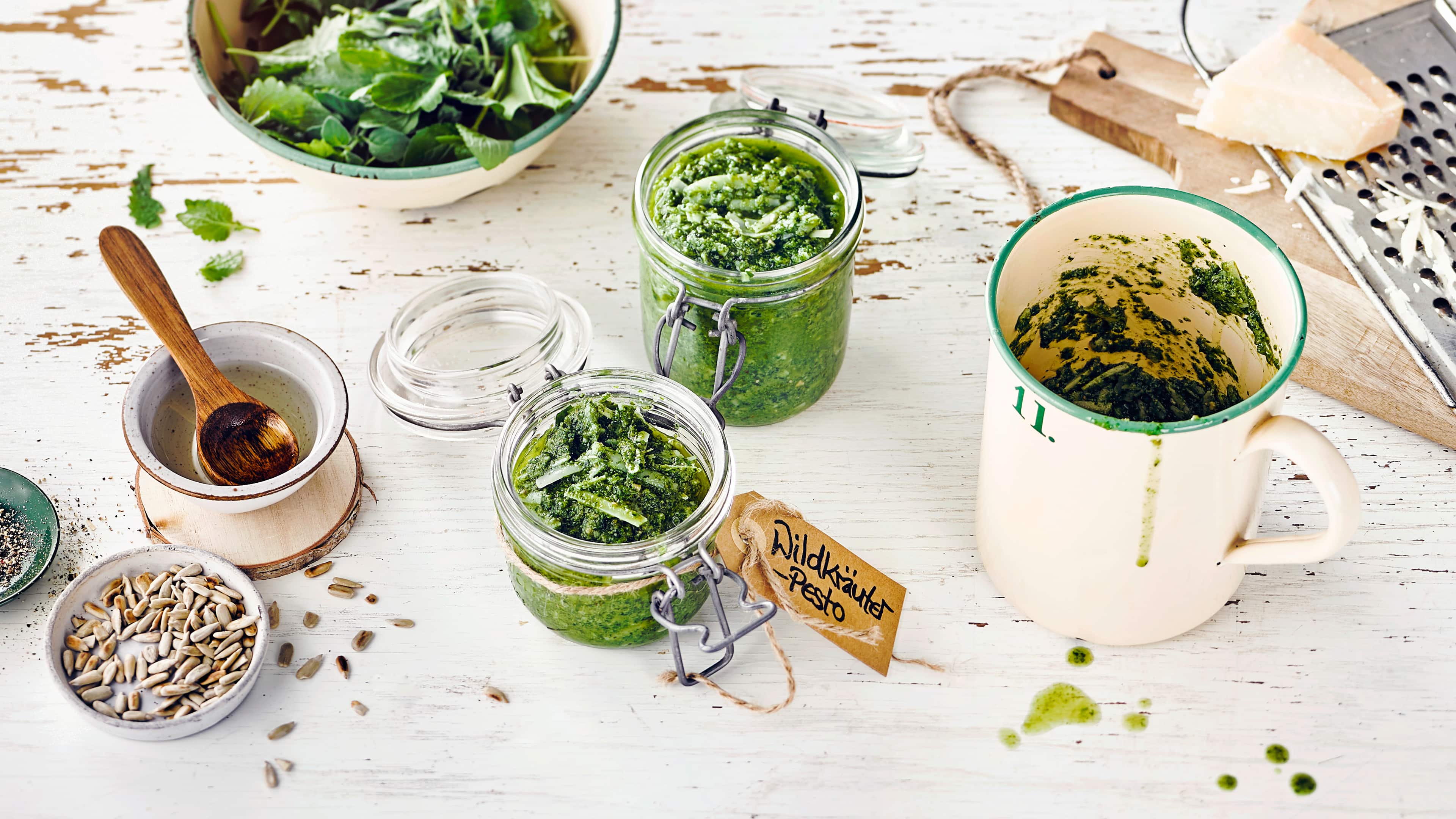 Die Sonnenblumenkerne in einer beschichteten Pfanne ohne Zugabe von Fett circa 3 Minuten goldbraun anrösten. Die Kerne auskühlen lassen und zu den Kräutern geben. Oliven- und Rapsöl ergänzen und mit dem Pürierstab grob pürieren.