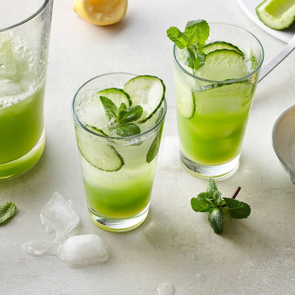 3. Zum Servieren pro Glas 3-4 Eiswürfel, 1/3 Limonade und 2/3 Mineralwasser hinzugeben und mit 1 Zitronenscheibe dekorieren.