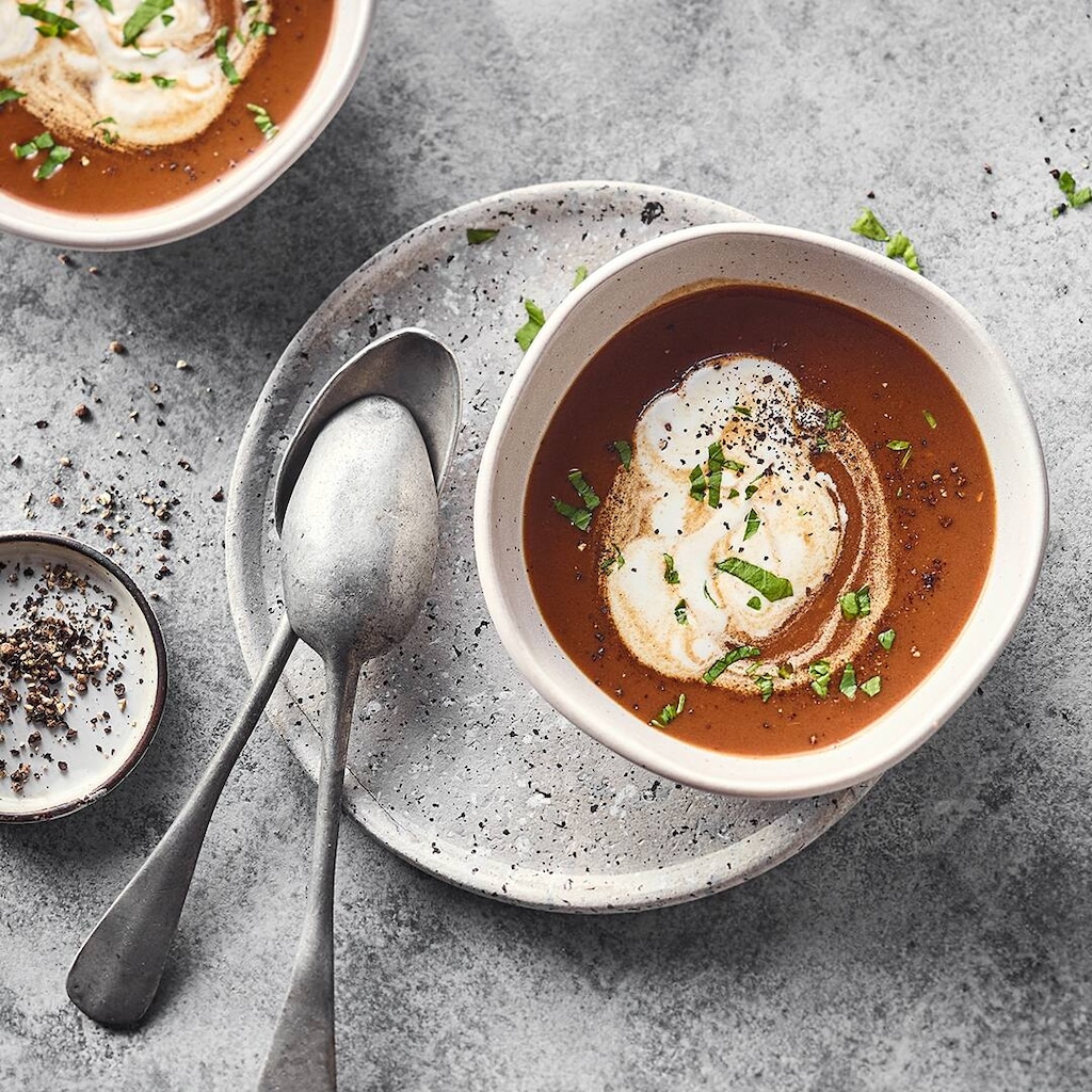 Blumenkohl-Broccolicremesuppe mit Hummus-Crostini