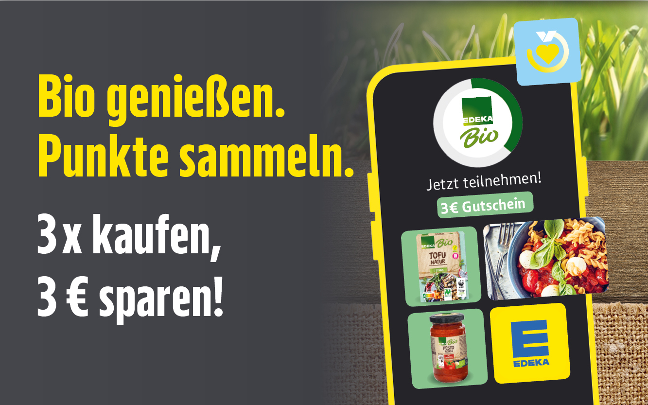 Challenge in der EDEKA App aktivieren, 3x im Aktionszeitraum vom 02.02-28.02.26 mit mind. je 1 EDEKA Bio Produkt einkaufen und 3 €-Gutschein für deinen nächsten Einkauf ab 30 € erhalten.